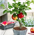 Detta är naturligtvis inget äkta bonsaiträd, men en ljuvlig äppelsort har ympats på en riktigt liten stam. Trevlig och iögonfallande på ett terrass- eller balkongbord.