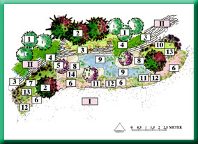 Längst bak i rabatten finns två grupper med Viburnum tinus (1), en vintergrön buske som blommar under hösten och vintern med rosaröda blomflockar. Mellan dessa grupper blommar Buskrosen "Stromboli" [Rosa "Stromboli"] (2) mellan juni och oktober. De dubbla blommorna kommer i grupper och de är mycket påfallande. Den rosa Saponaria [Saponaria ocymoides] (3) och den blå Stjärnklockan [Campanula poscharskyana] (4) blommar samtidigt som rosorna och de slingrar sig vackert över muren.