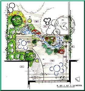 Längs bäcken finns växter med olika bladformer, som de dekorativa parbladiga bladen på Majbräken [Athyrium filix femina] (5) och de stora bladen på Hostan "Halcyon" [Hosta tardiana "Halcyon"] (6). Klippstånds [Ligularia dentata] (7) har enorma hjärtformade blad och robusta stjälkar med stora gula blommor. Det är en mycket imponerande vattenkantsväxt. Den Sibiriska irisen [Iris siberica "Butter and sugar"] (A) blommar i maj, med fantastiska blekgula blommor. Blomställningarna på Hyacintvivan [Primula vialii] (8) är mycket ovanliga. Lila blommor växer i kompakta spetsar, och knopparna högst upp är klarröda. Bredvid vattenanläggningen står Bergbambu [Sinarundinaria murielae] (9). Denna vintergröna växt kan utvecklas till en ansenlig klunga bamburör, som gungar i vinden. De kan bli upp till två och en halv meter höga. Den utgör en vacker kombination med Pennisetum [Pennisetum compressum] (10), ett prydnadsgräs som får rödbruna ax om hösten. Gräset är också vackert om vintern.