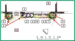 Lavendeln [Lavandula ang. "Munstead"] kommer strax efter vid ungefär samma tid som geranium "Patricia" (4). Denna ganska höga geranium blommar ständigt med ovanliga magentafärgade blommor och ett svart hjärta. Den påfallande kombinationen med den blå gräsfibblan [Catanache Caerula] (8) ger rabatten en verkligt glad sommarframtoning.