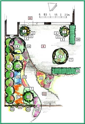 Längst till vänster finns magnolia [Magnolia lilliflora "Susan"] (8), en magnolia med stora, djupröda blommor med en häpnadsväckande väldoft. Detta tidigblommande lilla träd växer ut ganska mycket och blir slutligen cirka 3 meter högt. Rabattens kant bildas av syrénbuddleja [Buddleia davidii, abeliophyllum, Rosa rugossa, Philadelphus, Syringa vulgaris] (9). Denna buske har valts så att någonting blommar vid olika tidpunkter. Det är en friväxande häck och därför behöver den lite utrymme.