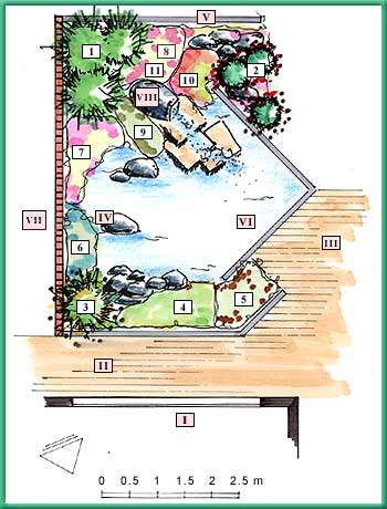Brokig bambu [ Phyllostachys aureosulcata "Spectabilis] (1), till vänster baktill i trädgården är vintergrön och ger struktur åt denna del av trädgården, sommar som vinter. Denna förädlade växt är cirka 1,5 m hög och är därför även lämplig för mindre trädgårdar. Till höger bildar en grupp med tre Rhododendron (2) en vintergrön bakgrund. På våren blommar dessa buskar med yppiga blommor. Dvärgpampasgräs [Cortaderia selloana "Pumila"] (3) passar i alla vattenträdgårdar. På hösten får detta prydnadsgräs vackra beige plymer. Växten behöver skyddas mot stark frost, särskilt nedtill. Bind samman bladen och slå in växten i en matta. Framtill och intill dvärgpampasgräset övergår vattenbassängen gradvis i ett sankt område. Här finns Glansiris [Iris laevigatae "Snowdrift"] (4). Dessa särpräglat formade vita blommor förtjänar en närmare titt. Smalkaveldun [Typha angustifolia] (5) med sina karaktäristiska "cigarrer" känner sig verkligen hemma här. Längs muren växer några bladrika växter. Stora blad som hänger över vattenkanten är alltid effektfullt. Intill Hosta [Hosta - blandade] (6) finns några Kallor [Zantedeschia - skär] (7). Dessa rotknölar kan drivas upp inomhus och flyttas ut i mitten av maj. De vackra skära blommorna vara genom hela sommaren. Runt bambun och rhododendron växer olika ovanliga växter med skära blommor. Den marktäckande Rosenkronill - Coronilla Varia (8) blommar rikligt juni-september. På båda sidorna växer två praktfulla växter. Rosenincarvillea [Incarvillea delavayi] (9) har ormbunksliknande blad från vilka stora, mättat skära blommor slår ut på sommaren. Hyacintviva [Primula vialii] (10) har blomsterax i klara färger som nästan ser konstgjorda ut. Toppen av axet är röd, och de små blommorna nedanför är skära. Längst bak i trädgården blommar en kombination av röda, botaniska Tulpaner och vita Krokusar [Tulipa 'Scarlet Baby' + krokus] (11) från april och framåt. De kan planteras i små grupper bland perennerna.