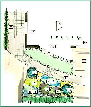 Fonden för denna rabatt utgörs av en häck av lagerhägg [Prunus laurocerasus "Rotundifolia"] (1). Denna städsegröna häck har skinande gröna blad. Om du inte vill att häcken ska växa sig för hög och bred måste du beskära den regelbundet. De två koreagranarna [Abies koreana] (2) har planterats på var sin sida om rabatten. Mest anmärkningsvärt med detta barrträd är dess fantastiska blåvioletta kottar. Under barrträden växer den marktäckande gyllenfetknoppen [Sedum acre] (3). Den kommer att bilda en tät matta av små gula blommor i juni. Samtidigt blommar kaukasisk näva [Geranium platypetalum] (4). De blå blommorna på denna näva kontrasterar vackert med den gula gyllenfetknoppen. Baktill ger en stor grupp riddarsporrar [Delphinium] (5) höjd åt rabatten. Växterna blommar i juni och i september igen. De imponerande blomsteraxen kan bli upp till 50 cm långa. Ge växten stöd innan den blommar för att hindra att den lägger sig på marken i kraftigt regn. Mitt i rabatten växer en syrenbuddleja [Buddleia davidii] (6). Denna buske blommar från juni och framåt. Den drar till sig många fjärilar. Beskär den varje vår så ser den alltid bra ut. Men gör det inte för tidigt, eftersom den är känslig för frost. Prakthyperikum [Hypericum calycinum] (7) intill syrenbuddlejan, blommar under en mycket lång period med gula blommor och håller sig dessutom grön hela vintern. Bakom den lägger en stor grupp flox [Phlox "Laura"] (8) färg till rabatten med stora violett-blå blommor på hösten. En kombination av den gula tulpanen "Tarda" och de blå pärlhyacinterna [Muscari arm.] (9) planteras i små grupper i rabatten. Båda är lämpliga för naturalisering och kan därför vara kvar i marken efter blomningen.
