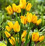 Skär till en liten bukett av den skarpt gula tulpanen med ljust röda ränder. Denna flerblommiga tulpan drar till sig uppmärksamhet i varje trädgård eller vas.