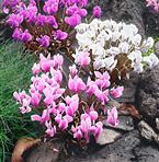 Fulljordscyklamen som börjar blomma mot slutet av sommaren. Djup skugga utgör inget problem för en riklig blomning i vitt och olika nyanser av rosa. Passar väl till förvildning. Vinterhärdig. Zon 2-3.