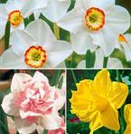 De dubbelblommiga narcisserna har en extra krans av välfyllda blomblad. Blommorna förekommer därför i alla möjliga färgkombinationer. Blomningstiden är ständigt och jämt förvånansvärt lång och de behöver inte tas ur jorden. Lämna dem bara ifred. De kommer översvallande tillbaka varje år. En bukett dubbla narcisser i vas är dessutom verkligen en praktfull syn.