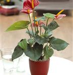 Kallas också Flamingoblomma. Fin krukväxt tillverkad i högsta sidenkvalitet och smyckad med 4 magnifika röda blommor. Växten levereras i odlingskruka. Den är 40 cm hög och 30 cm i diameter. Går inte att skilja från den äkta växten. Dekorationskruka medföljer ej.