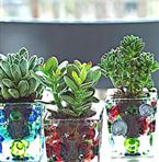 3 Suckulenter i 3 mönstrade glas. Kan ställas i fullt solsken. Dekorativa som rumsväxter, men passar också för en solig sommarbalkong. Kräver endast lite vatten och behöver ingen näring. Leveranshöjd c:a 10-15 cm. Glas: 6 x 6 cm.