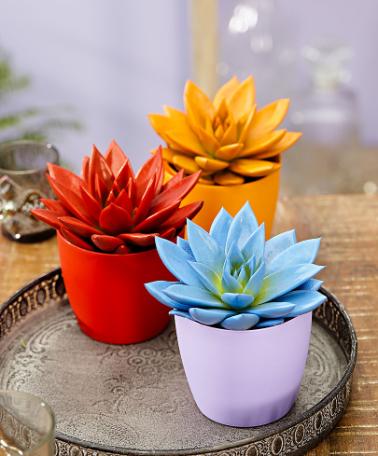 Dessa Echeveria har färgats. I slutändan kommer dess naturliga gröna färg på bladen att ta över.