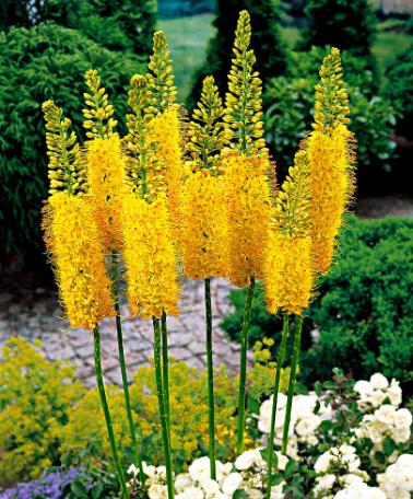 Gul stäpplilja har hundratals små blommor som vissnar nedifrån och uppåt. Bladen visar sig tidigt i stora klungor och börjar vissna just som blomspetsarna visar sig. Gul stäpplilja är fullständigt härdig och föredrar en sandig, väl dränerad jord.