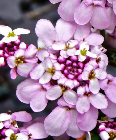 Iberis 'Pink Ice'® är känd för att ha lite skeva eller krokiga blommor. Den ser faktiskt lite snedvriden ut med två stora och två små kronblad!