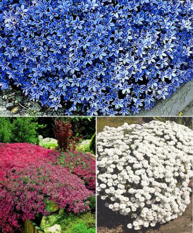 Du kommer att få 15 marktäckande växter för fullt solsken eller delvis skugga. Den perfekt matchade kollektionen består av Vinteriberis (Iberis sempervirens), Såpört (Saponaria ocymoides) och Murklocka (Campanula portenschlagiana). De här låga, krypande växterna kompletterar varandra perfekt. Nyanserna vitt, rosa och blått är en underbar färgkombination.