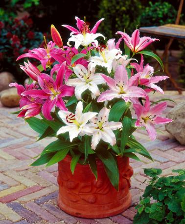 Orientaliska liljor i krukaTack vare sina starka stjälkar växer orientaliska liljor också mycket bra i blomkrukor och planteringslådor. Du kan fylla hela krukan med de här vackra liljorna, genom att helt enkelt arrangera lökarna med ungefär 10 cm mellanrum. Du kan också kombinera dem med andra liljelökar och sommarastrar (Callistephus), som har lägre växthöjd.
