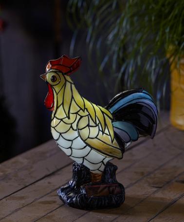 Den här dekorativa tuppen lockar till sig uppmärksamheten både dag och kväll. Belysningen drivs med hjälp av solenergi och tillsammans med glas-i-bly åstadkommer det en unik effekt. Tillverkad i konststen. Höjd ca 22 cm.