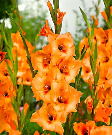 Kombinera storblommiga gladiolerDe här vackra storblommiga gladiolerna har extra stora blommor som är fulla av färg. Du kan skapa vackra kombinationer längs rabatten. Placera till exempel en grupp storblommiga gladioler bredvid Zantedeschia och dahlior. Den här storblommiga sorten är också en utmärkt snittblomma.