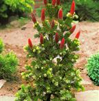 De rödgröna kottarna gör denna gran till en alldeles speciell uppenbarelse i trädgården. Vinterhärdig och motstår vinden väl. Zon 7.