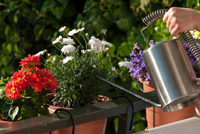 Tips: Fyll ett stort kar (ett cementblandarkar t.ex.) med vatten och låt det stå för att värmas upp lite. Doppa din korg i karet och låt den stå där en halvtimme. På detta sätt mättas jord och rötter och behöver inte vattnas på några dagar. Om du har flera korgar, kan du doppa dem en efter en. Detta sparar vatten och är mycket praktiskt när du vill åka bort några dagar.
