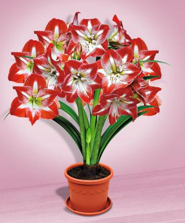 Hippeastrum 'Minerva' har vackert röda blommor med ett stort vitt center. Mellan det röda och vita syns graciösa linjer. Det kommer ofta tre stjälkar från samma lök. De bär alla mellan 3 och 4 blommor. De vackra iögonfallande blommorna kan också beundras i en vas eller ett blomsterarrangemang. Hippeastrum är fortfarande känd under sitt gamla namn, Amaryllis.