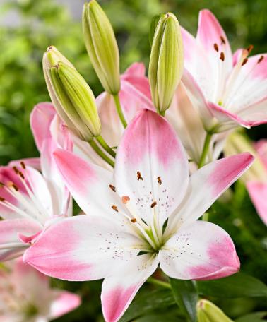 De vackra Lilium 'Sugar Love' blommar tidigt på sommaren i vitt med rosa. Blommorna är ganska öppna och uppåtriktade. Dessa asiatiska liljor står på robusta stjälkar och utmärkt för krukor, men står naturligtvis vackert i en solig rabatt också.