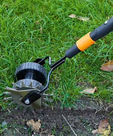 Med den här roterande kantskäraren kan du enkelt trimma gräsmattans kanter. De vassa knivarna skär av gräset som vuxit över gräsmattskanten. De dubbla hjulen gör det lätt att hålla kursen och forma perfekta kanter på gräsmattan.