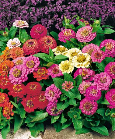 Zinnia elegans ’Thumbelina’ Mix består av mycket lågväxande (ca 15 cm) plantor som har dubbla blommor i olika och starka färger.