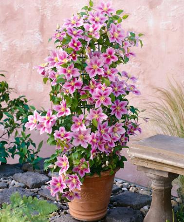 Klematis 'Piilu' är unik med sina stora rosa blommor. Deras kronblad har en bred rosa rand och dess centrum är fyllda med vita ståndare. Den är kompakt och kan växa upp till 3 meter högt. Blommorna kommer på skott som utvecklades föregående år. De första blommorna är till en början dubbla, men senare på sommaren kommer de att vara enkelblommiga fast många fler!