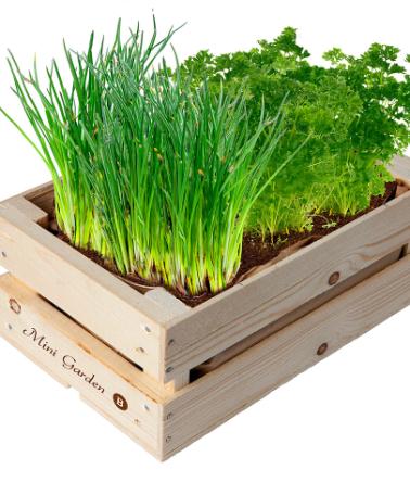 Även om du har en liten trädgård, kök eller balkong! Du får en trälåda med jord och frön att odla persilja och gräslök.