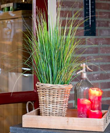 Detta vackra prydnadsgräs går knappt att skilja från äkta. Dekorativt på terrass eller balkong och helt underhållsfritt. Du kan njuta av den här konstgjorda växten under flera år. Levereras i en innerkruka av plast och har en höjd av ca 60 cm.