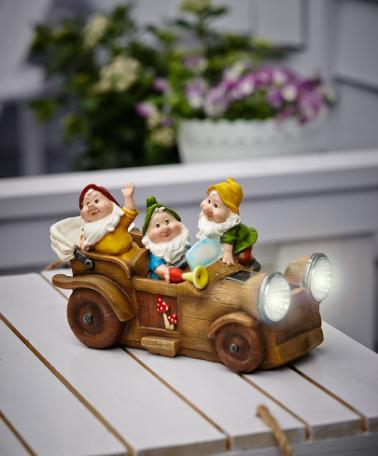 De här glada tomtarna är ett roligt blickfång, speciellt på kvällen, då strålkastarna på bilen tänds automatiskt när det blir mörkt ute. Tillverkad av väderbeständig konststen, så den kan placeras utomhus. Mått: 14 x 21 cm.