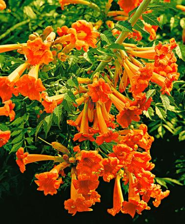 Den här exotiska, rikblommande klätterväxten med stora rödoranga blommor kommer att stjäla föreställningen i slutet av sommaren. Stjälkarna håll sig fast med sina luft rötter. När den odlas i ett soligt område kan den storblommiga trumpetrankan klättra upp till över 5 meter högt. Bladskaften kan bli upp till 45 cm långa, och längs skaften sitter mindre blad.