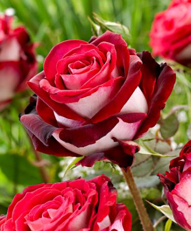 Storblommiga rosor är utmärkta kombinationsväxter.Den storblomstrande rosen 'Osiria' har blodröda kronblad på insidan och helt silvervita på utsidan. De blommar från juni till första nattfrosten. De här rosorna kommer att utgöra riktiga höjdpunkter i din trädgård och är vackra om de kombineras med buxbomshäcken. Du kan även plantera lägre växande plantor runt basen på rosenbusken som Rosenplister eller plantera en grupp Lavendel bredvid dem. Under hösten kan du också plantera några tulpaner mellan buskarna för att ge kontinuerligt intresse under nästan hela året.